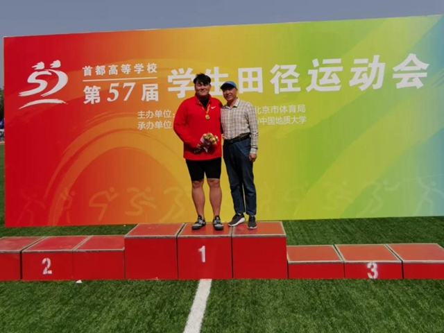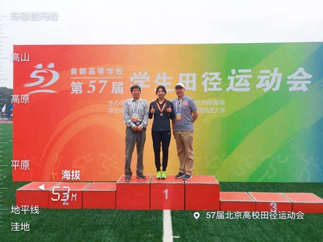 2016级的张妍同学近年首都高校比赛中获得一届冠军和一届亚军,是不折不扣的“挣分大户”,今年她在教练员李涛老师的带领下面对脚伤处置得当,在赛场上稳定发挥,凭借着自己过硬的实力在女子跳远和三级跳比赛中双双斩获银牌。 管院2014级程凯威获得男子跳高铜牌。