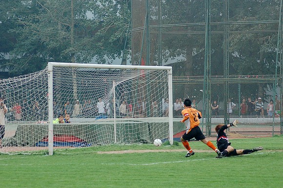 面对守门员的封堵,袁微镇定自若,轻松晃过守门员,将球推入网底,并锁定胜局。