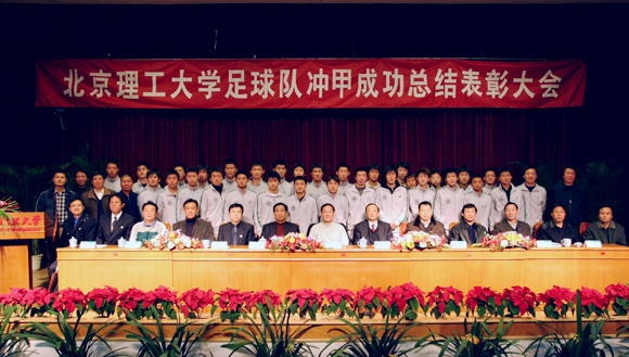 表彰大会上,学校体育部主任刘启孝汇报了足球队近年来所取得的成绩。北京理工大学足球队自2000年成立以来,四次荣获全国大学生足球联赛冠军,代表中国出征世界大学生运动会,取得第七名的好成绩。今年,在全国足球乙级联赛中脱颖而出,荣膺桂冠,成为第一支成功冲入全国足球甲级联赛的“学生军”。 这一成就引起了社会的广泛关注,在社会上树立了学校和当代大学生的良好形象。
