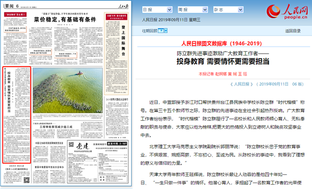 近日,中宣部授予浙江对口帮扶贵州台江县民族中学校长陈立群“时代楷模”称号。在第三十五个教师节之际,陈立群的先进事迹在全社会引起热烈反响。广大教育工作者纷纷表示,“时代楷模”陈立群履行了一名校长和人民教师倾心育人、无私奉献的职责与使命,大家应以他为榜样,把更大的热情投入到立德树人和脱贫攻坚事业中去。