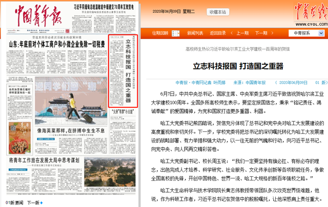 6月7日,中共中央总书记、国家主席、中央军委主席习近平致信祝贺哈尔滨工业大学建校100周年。全国多所高校师生表示,要坚定报国信念,秉承“铭记责任、竭诚奉献”的爱国精神,为党和国家打造更多重器、利器。