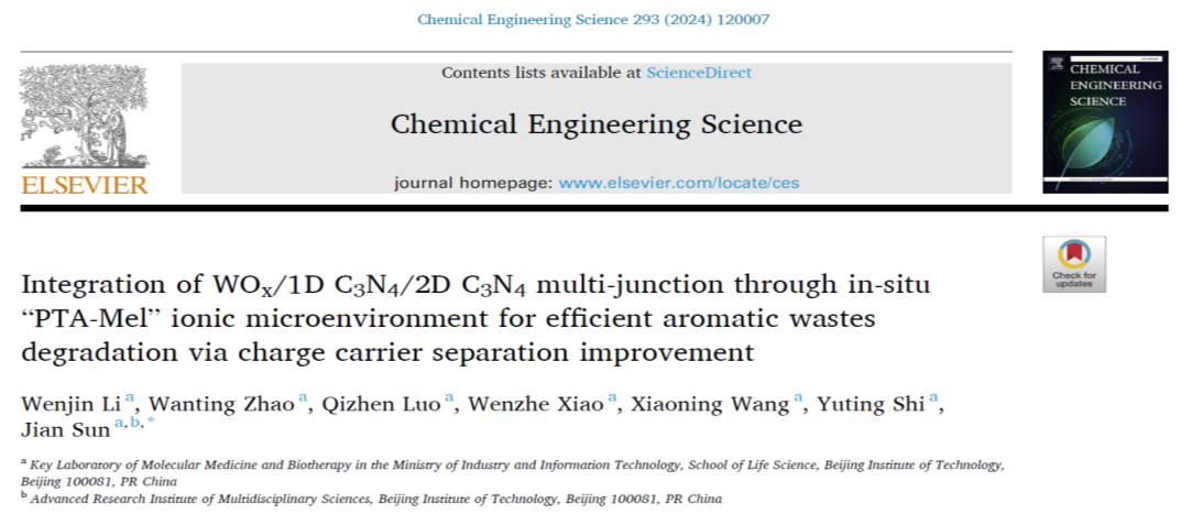 论文详情:Wenjin Li, Wanting Zhao, Qizhen Luo, Wenzhe Xiao, Xiaoning Wang, Yu ting Shi, Jian Sun*, Integration of WOx/1D C3N4/2D C3N4 multi-junction through in-situ“PTA-Mel“ ionic microenvironment for efficient aromatic wastes degradation via charge carrier separation improvement. Chem. Eng. Sci., 2024, 293, 120007.