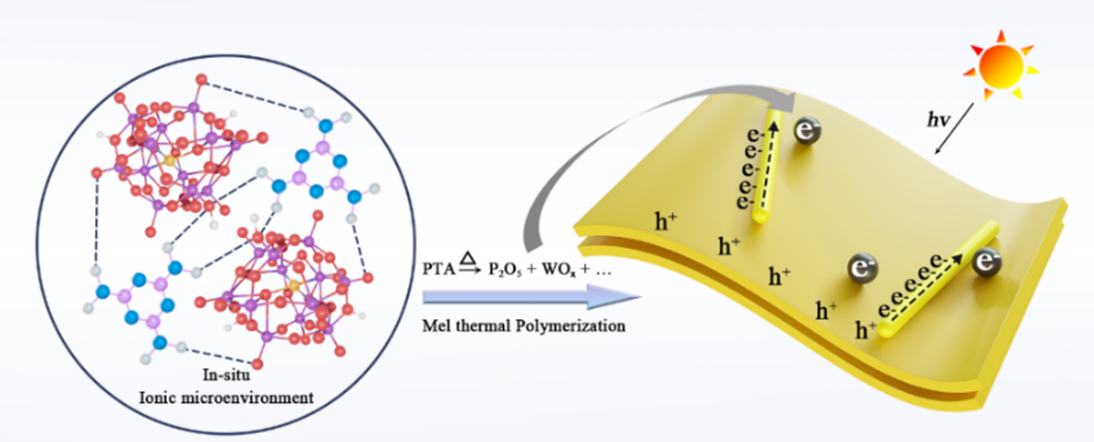 作为一种可见光响应的非金属有机半导体,石墨相氮化碳(g-C3N4)具有合成简单、物化性质稳定、绿色经济、带隙宽度合适等优点,被广泛应用于污染物降解、光解水制氢、光动力抗菌等方面。为了弥补改善g-C3N4比表面积低、载流子复合严重、可见光利用率低等缺陷,需要对其进行结构改性和性能优化。作为一种可以影响材料制备、改性和应用的功能介质,离子液体自身结构可设计和调节,根据需要可以发挥溶剂、模板剂以及结构修饰剂等功能,从而在构建内建电场、异质结、均质结以及杂原子掺杂等方面具有潜在应用潜力。为此,团队分别开展了不同类型的离子液体对g-C3N4结构及性能改性研究,旨在获得离子液体的特殊离子微环境对于半导体催化剂的结构调控和性能提升的机制和规律。相关系列进展包括:提出了以聚合离子液体微球作为“电子储体”的结构后修饰策略,获得了性能提升的产氢效果( Chem. Eng. J. , 2022, 440, 135625);通过均相咪唑基离子液体作为溶剂,调控构筑“IL-Mel”簇,实现了对g-C3N4表界面性质的改善,将光降解效率提高到2.3倍,并在细菌感染伤口的光动力治疗中表现出优异的性能( Small Methods , 2024, 2301378)。