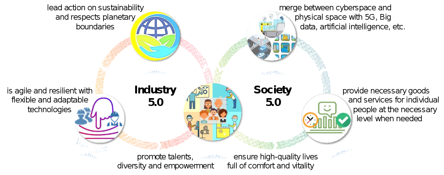 文章围绕当前工业领域热点“工业5.0”与新型概念“社会5.0”的区别、互补以及共同演进趋势进行了深度讨论,旨在阐明工业5.0和社会5.0两种提法共存情况下的本质诉求以及未来的发展方向。工业5.0是一种面向未来工业、富有远见的新范式,是对工业4.0单纯追求技术驱动的修正,追寻以人为本、可持续、富有韧性的价值创造。社会5.0则是对未来超智能社会的一种构想,让每个人都可以享受到技术发展的红利,旨在构建一个以人为中心、超智能化、精益型的社会。为了对工业5.0和社会5.0有更深层次的认知,进一步从目标、价值、组织和技术四个维度进行了比较和关联分析。虽然工业5.0和社会5.0关注的领域范围、关键技术等有所区别,但是在“以人为本”这一点上形成了共识:(1)工业领域里,人是生产制造活动的“主宰者”;(2)社会活动中,人民幸福提升、价值创造是核心。在未来,工业5.0和社会5.0也面临着一系列共同挑战和机遇,需要进一步突破人-信息-物理系统(HCPS)、人的数字孪生(HDT)、人-机器人协同作业(HRC)等核心技术,发掘具有创造性的应用场景和价值增长点。
