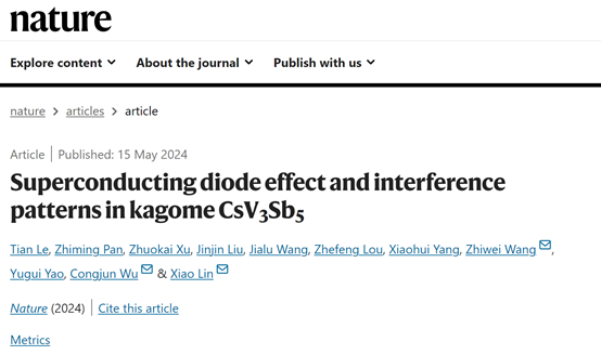 2024年5月15日,北京理工大学物理学院王秩伟教授、姚裕贵教授团队,与西湖大学林效教授、吴从军教授团队等人合作,在《自然》杂志上在线发表题为“Superconducting diode effect and interference patterns in kagome CsV3Sb5”的研究论文。首次在笼目晶格超导材料CsV3Sb5中观察到了零磁场超导二极管效应和超导干涉条纹,在一定程度上证明了CsV3Sb5中超导态具有时间反演对称性破缺的特征。