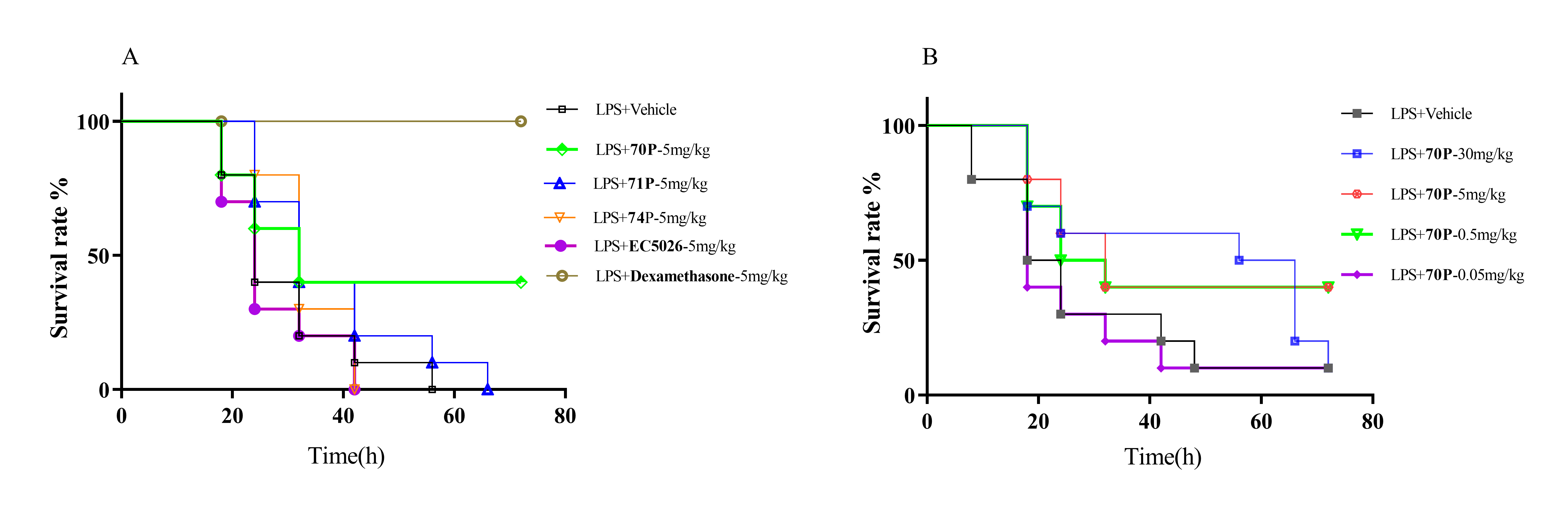 图3 70P(FZQ-21)、71P、74P和EC-5026治疗后败血症模型小鼠的存活曲线