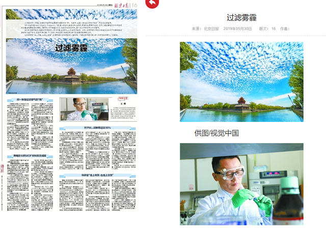 过滤PM2.5、杀菌、分解臭氧,如今一张MOF膜可实现的功能越来越多。“‘北京蓝’常驻京城,我们是有切身感受的。”回国8年,王博也经历了北京空气质量的改善,但他“对付”雾霾的步伐并没有放慢,“天帮忙,人更要努力,我们科研工作者一定要走在前面。”