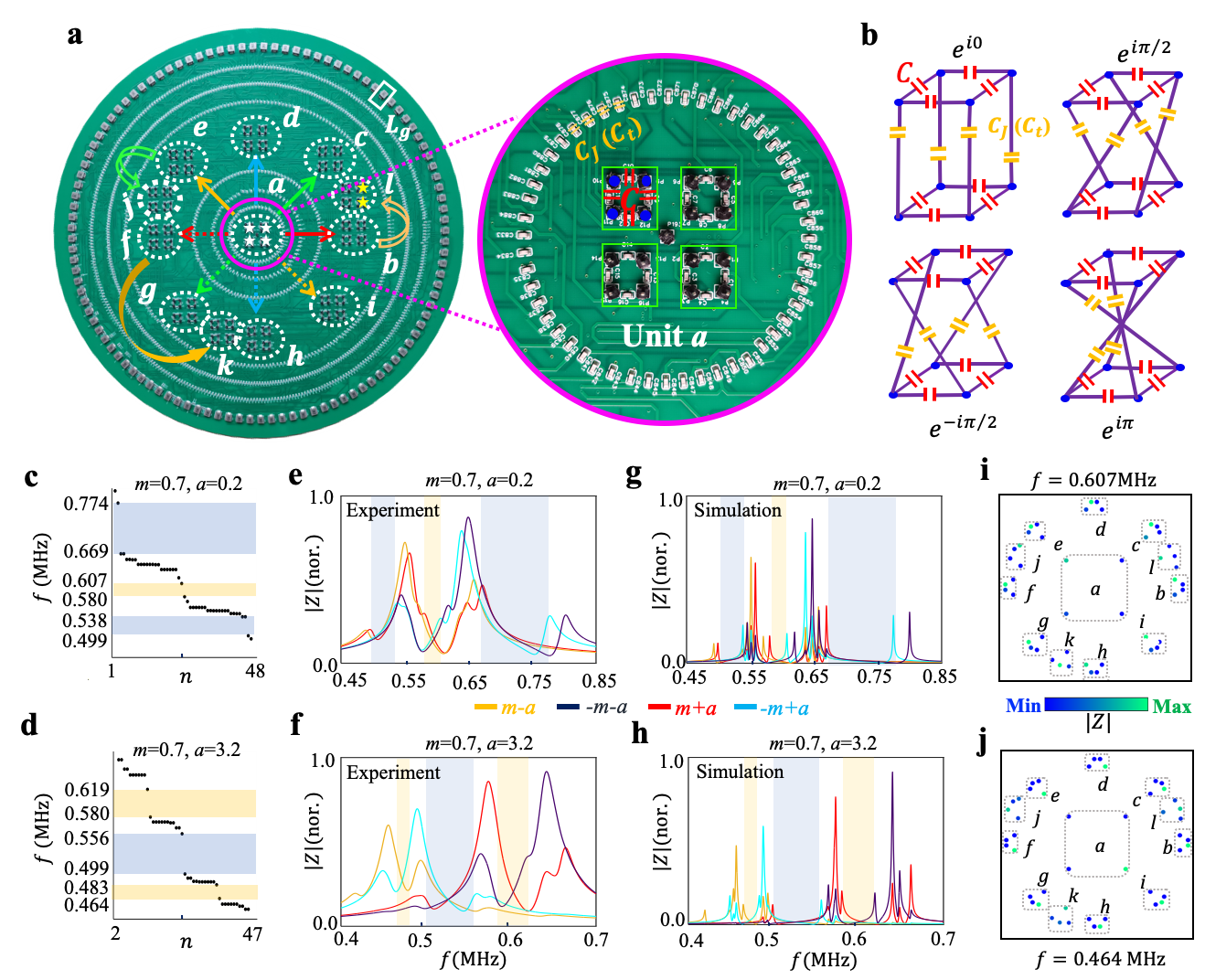 基于凝聚态晶格模型与电子线路网络的一致性,研究人员设计并制备了双曲电路网络(如图3a所示)实验上观察二阶陈数诱导的双曲拓扑边界态。图3b显示了对应于有效复数耦合的电路结构图。需要强调的是,与之前的平面双曲电路不同,具有周期边界的有限尺寸双曲晶格具有大量的非面内长程耦合。首先,研究人员对具有周期边界的有限双曲电路进行了实验测量。图3c和3d显示了实验测得的电路本征能谱,其中非平庸和平庸的带隙分别被橘黄色和蓝色区域标记。可以清晰的看到具有二阶和一阶陈数的双曲电路频谱与晶格模型能谱具有很好的一致性。图3e和3f以及3g和3h分别对应实验测量和理论仿真的电路阻抗结果。结果显示对应能隙的频率范围没有阻抗峰,表明双曲体带带隙的存在。图3i(二阶陈数)和3j(一阶陈数)展示的是体态对应频率下的电路阻抗分布图。可以看出其与双曲晶格模型中的本征态概率幅分布完全一致。