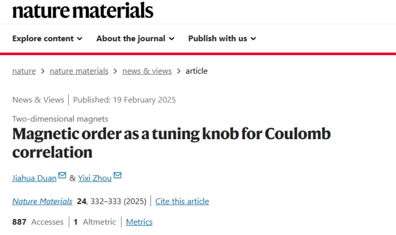 此外,Nature子刊《Nature Materials》邀请北京理工大学物理学院段嘉华教授撰写发表评述性论文,文章题为“Magnetic order as a tuning knob for Coulomb correlation”,评述了哥伦比亚大学Dimitri Basov院士团队和雷根斯堡大学R. Huber教授团队在Nature Materials发表的背靠背论文[Nature Materials 24, 384 (2025); Nature Materials 24, 391 (2025)],介绍了二维反铁磁材料中库伦相互作用调控研究的重要进展。研究表明二维CrSBr材料中的A类反铁磁序会阻碍电子-空穴对的层间跃迁,从而导致一种新的具有一维量子限域的光激发态:磁性表面激子。这一发现有助于理解二维磁性材料中的多体物理效应,而反铁磁序带来的限域效应将为纳米尺度上能量传输调控提供新的可能性。