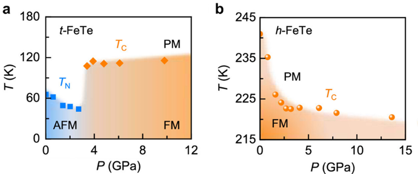 图2. 二维t-FeTe(a)和h-FeTe(b)的压力—温度相图。