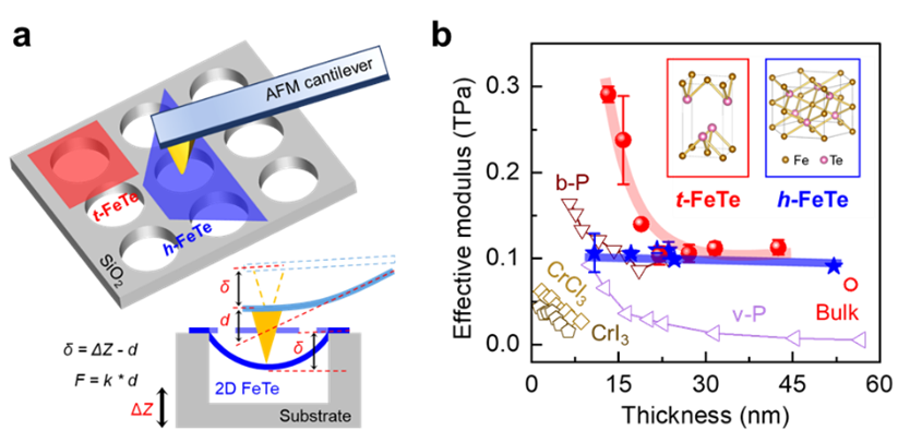 利用基于原子力显微镜的纳米压痕法,课题组成员在硅基悬空基底上探究了二维FeTe材料的杨氏模量(图3)。测试结果表明,四方相FeTe 的杨氏模量随着厚度增加而降低,在 13.2 nm 时,杨氏模量达到 290.9±9.2 GPa,在 22.0 nm 时,杨氏模量减小为 103.6±11.0 GPa,随着纳米片的厚度继续增加,杨氏模量基本保持不变。相反地,六方相FeTe 的杨氏模量随着纳米片的厚度变化不发生改变。对比分析发现,四方FeTe 纳米片的杨氏模量要大于六方FeTe 纳米片的杨氏模量。