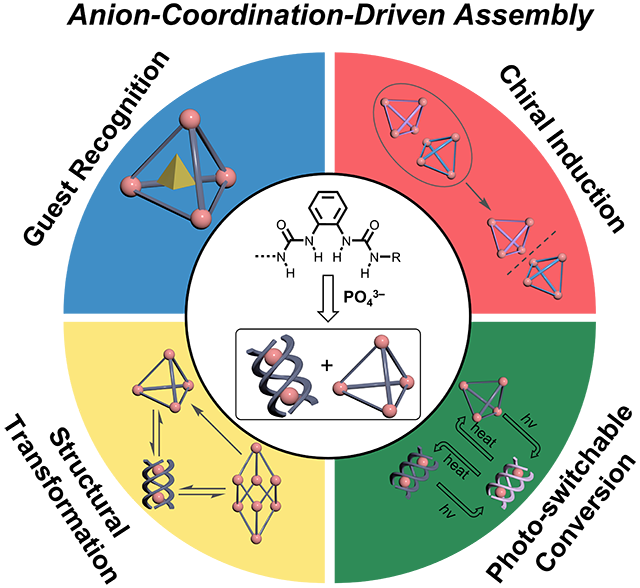 离散有序组装体的构筑及性能研究是化学领域的研究热点,通过拓扑结构的精准控制,其在分子识别、催化、药物递送、信息存储和能源材料等领域具有广泛应用前景。高级有序组装结构的构筑根据驱动力不同主要分为两类:共价相互作用和非共价相互作用;非共价作用具有组装基元易修饰、结构多样性丰富、可预测和选择性高等特点深受青睐。典型非共价相互作用主要包括:金属配位,氢键作用以及 π − π 相互作用等,在构筑高级有序组装结构方面取得了巨大成功,特别是过渡金属阳离子配位诱导组装。相比之下,基于氢键体系的阴离子配位作用强度低、选择性差、配位构象复杂难预测,一度被认为难以实现复杂有序组装结构的构筑。关于阴离子配位化学研究的起源和发展,可参考相关文献:Park & Simmons, JACS 1968, 90 , 2431; Lehn Acc. Chem. Res. 1978, 11 , 49; Bowman-James Acc. Chem. Res. 2005, 38 , 671。