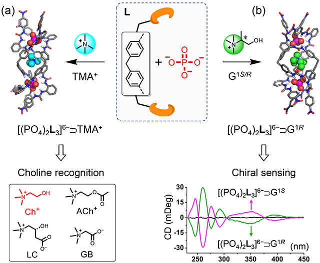 图3. 三螺旋对胆碱分子的高选择性结合以及对手性胆碱衍生物的传感示意图