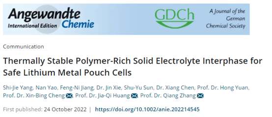 近日,北京理工大学前沿交叉科学研究院黄佳琦教授课题组在金属锂电池安全改善方面取得重要研究进展,相关成果以“Thermally Stable Polymer-Rich Solid Electrolyte Interphase for Safe Lithium Metal Pouch Cells”为题发表在化学类顶级国际期刊《Angewandte Chemie International Edition》(《德国应用化学》,影响因子16.823)。本文的通讯作者为北京理工大学黄佳琦教授,清华大学张强教授,东南大学程新兵教授,第一作者为北京理工大学前沿交叉科学研究院/材料学院硕士研究生杨世杰。