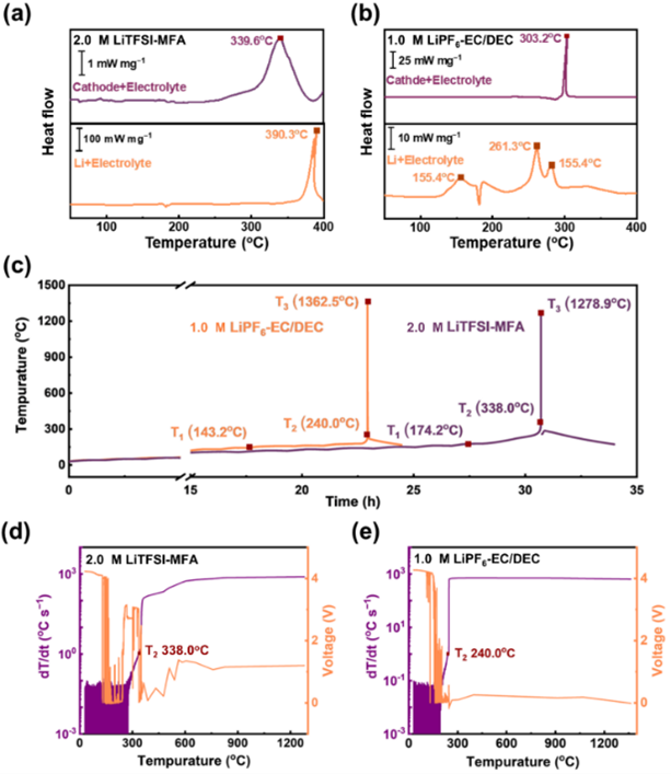 总之,优异的电解质分子设计成功地在金属锂电池中引入了新的表面聚合机理,其亲核位点的设计促进了电解质的聚合,而高氟取代提高了界面的热稳定性。更热稳定的电解质—金属锂界面显著地提高了电池热安全的临界温度,为安全操作和及时预警提供了更大的空间。此外,极高的电池“燃烧”温度(338.0℃)也证明了有效的界面控制可以成功降低锂金属负极的安全风险,通过界面聚合来提升安全性的设计思路也可以有效地应用于其他储能系统中。