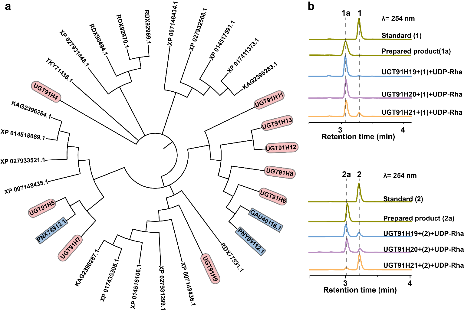 以上述表征的UGT91H亚家族酶的序列为探针,建立了基于进化分析的快速酶挖掘方法,对NCBI数据库中8种豆科植物基因组进行系统分析和挖掘,共获得23个候选酶,最终证实19个为UGT91H亚家族酶,大大提高了酶挖掘的效率和准确性。从中挑选了PNY09112.1、GAU40116.1和PNX78912.1进行功能表征,均表现出对三萜化合物C2 '' -OH特异性修饰一分子鼠李糖基或木糖基的活性。此外,GAU40116.1和PNY09112.1还对UDP-Gal具有微弱的新活性。