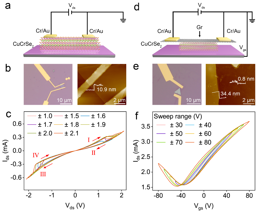 本文制做了水平和垂直器件,用于验证CuCrSe2的存储应用。在不施加栅压的情况下,水平切换源漏电流,获得了不同最大扫描电压下的 Ids-Vds 曲线 (图5c)。显然,从1.6V开始, Ids-Vds 曲线出现了迟滞回线,表明在1.6V附近有两个临界电压对应于IP铁电极化反转。当施加正电压从0到2.1V时,器件进入低阻态(LRS),这源于之前负电压导致的负极化(过程I)。当电压达到临界电压时,负极化状态转变为正极化状态。减小的电流表明器件进入高阻态(HRS)。当电压从2.1V扫描到0V时,由于正极化平行于外部电场,器件保持在HRS(过程II)。当施加负电压从0到2.1V时,正极化状态开始切换到负极化状态(过程III)。当负电压降至1.8V时电流减小,表明该器件进入到LRS。该状态转变的延迟是由于极化反转的缓慢过程。随后,当负电压从~1.6V降至0V时,器件保持在LRS(过程IV)。高低阻态可根据外加电场的反转而切换,证明二维CuCrSe2中存在面内铁电性。随后,通过石墨烯(Gr)置于顶部用作载流子传输通道,与CuCrSe2堆叠制做成Gr/CuCrSe2垂直器件以实现OOP铁电开关(图5d)。在垂直器件中,观察到周期性的 Ids-Vgs 迟滞回线和明显的Dirac电压偏移,这是由于CuCrSe2纳米片中OOP铁电极化切换和从CuCrSe2到石墨烯的电荷转移。综上所述,外加电场可调控IP和OOP铁电极化切换。