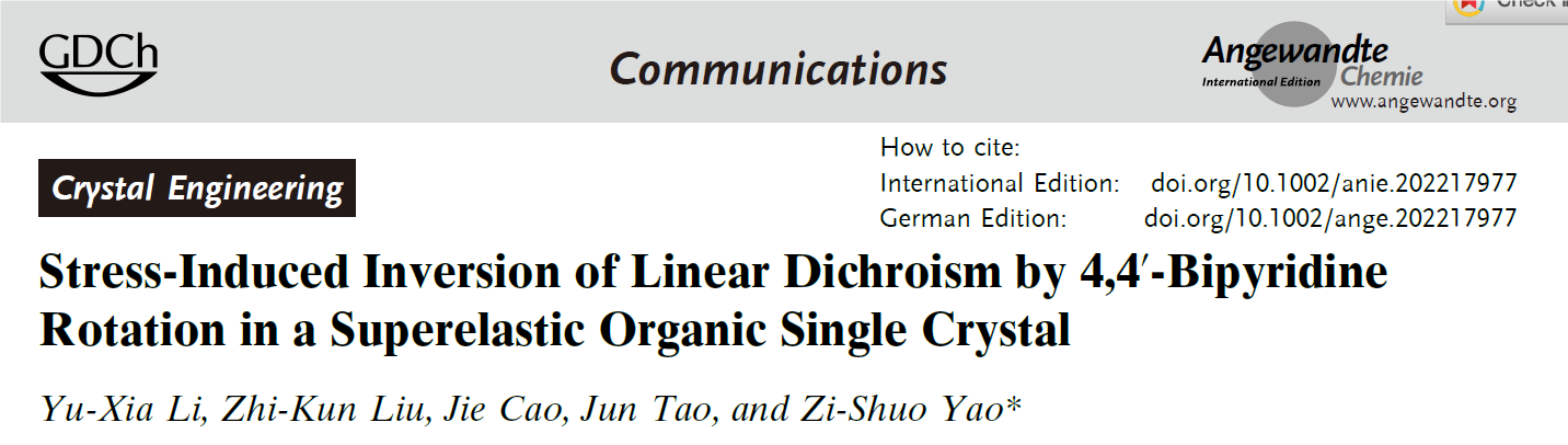 近日,北京理工大学化学与化工学院姚子硕研究员在超弹性分子基单晶材料研究中取得重要进展。相关工作以“Stress-Induced Inversion of Linear Dichroism by 4,4′-Bipyridine Rotation in a Superelastic Organic Single Crystal”为题,发表在国际著名化学期刊 Angew. Chem. Int. Ed. 。北京理工大学为唯一作者单位,化学与化工学院陶军教授研究团队的姚子硕研究员为文章通讯作者,文章第一作者为北京理工大学博士研究生李宇霞。