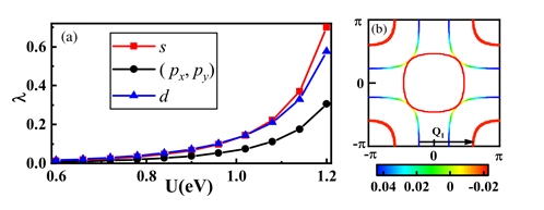 北京理工大学物理学院杨帆教授课题组与合作者通过细致分析实验现象,提出“交换密度波涨落”的超导机理。基于此观点,他们首次采用无规相近似方法对材料的宏观性质作了系统的微观理论计算,结果显示超导的配对对称性为s±-wave(图1)。该观点受到镍基超导研究领域的广泛认同和跟进,成为该研究领域有影响力的观点之一。