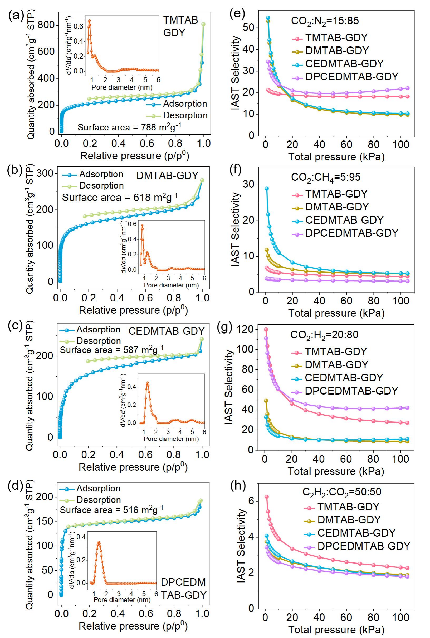 气体吸-脱附实验表明TAB-GDY具有较大比表面积和丰富的微孔结构,另外,由于TAB基团的缺电子性和乙炔键的富电子性,TAB-GDY在二元气体中表现出一定的IAST选择性。其中,DPCEDMTAB-GDY对CO2/N2和CO2/H2的选择性最大,分别为21.8和41.9,其次为TMTAB-GDY、CEDMTAB-GDY和DMTAB-GDY。此外,四种TAB-GDY对CO2/CH4(3.1-5.3)和C2H2/CO2(1.8-2.3)的选择性相似。