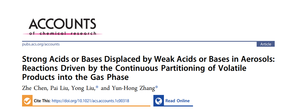 近日,Accounts of Chemical Research(《化学研究评述》)以“Strong Acids or Bases Displaced by Weak Acids or Bases in Aerosols: Reactions Driven by the Continuous Partitioning of Volatile Products into the Gas Phase”为题,在线发表了北京理工大学化学与化工学院张韫宏团队的综述文章,讨论了气溶胶体系中弱酸(弱碱)置换强酸(强碱)的独特现象。