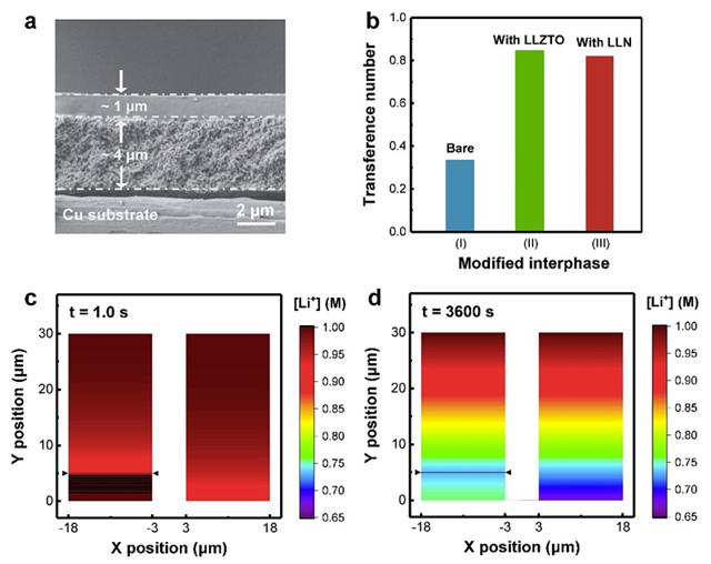 作者通过迁移数的测试,定量证明了该LLN保护层具有高达0.82的锂离子迁移数(不含LLN层时仅为0.33)。结合有限元模拟可直观发现在引入了单离子界面后,锂离子浓度梯度的堆积得到显著缓解,这一行为对于后续的金属锂规则沉积具有重要意义(图2)。