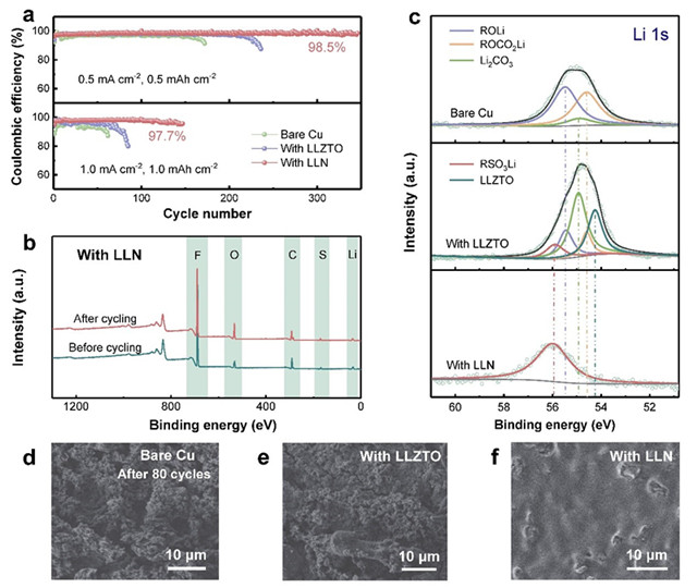 在结构方面,该无机-有机双层构型展现出独特的稳定性。基于Li-Cu半电池的电化学测试中,LLN膜保护的电极在0.5 mA cm-2和1.0 mA cm-2下分别具有高达98.5%和97.7%的库伦效率。将1.0 mA cm-2下循环多圈的电极表面进行XPS与扫描电镜表征,发现具有该双层构型的界面膜保持着良好的原始形态,未探测到SEI或金属锂的信号。该优异的结构稳定性是维持长效金属锂保护的重要保障。