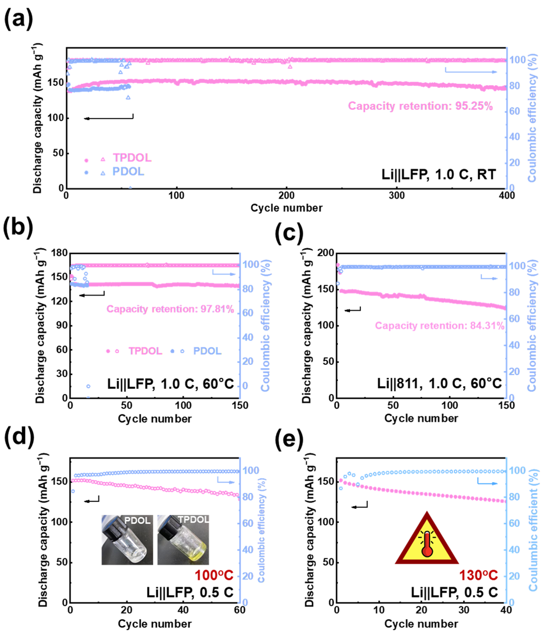 组装了全电池以进一步验证TPDOL电解质的应用潜力。由于TPDOL电解质可以构筑更稳定和机械强度更高的富无机SEI层,Li||LFP电池的初始放电容量提高到了148.5 mAh/g,在400次循环后仍保持了95.2%以上的高容量。由于TPDOL电解质具有优异的高热稳定性和在负极界面可以构筑TGIC衍生的富无机SEI,TPDOL电解质能帮助Li||LFP全电池在60℃时实现高达141.84 mAh/g的初始放电容量,并能够在200多个循环中稳定地进行充放电,高容量保持率高达97.81%。进一步,Li||LFP电池在100 ℃下能够实现超过70个循环的稳定循环性能,当工作温度持续升高到130°C时,Li||LFP电池仍能稳定循环超过40个循环(图4)。