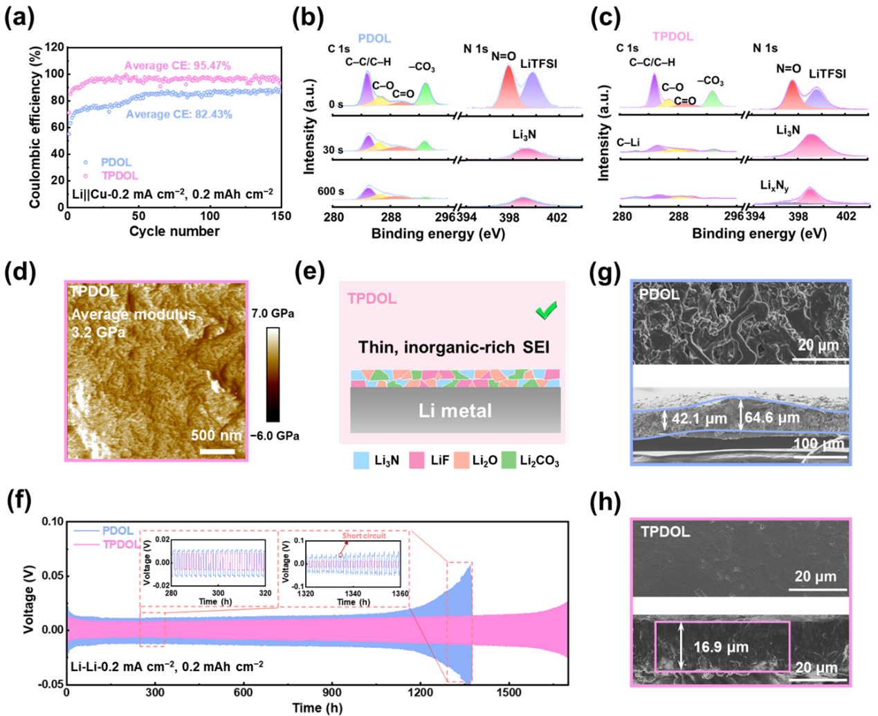 此外,在Li||Cu半电池中,TPDOL电解质可以帮助电池循环150次,并保持95.47%的高平均库仑效率。X射线光电子能谱测试显示,TPDOL电解质中金属锂负极的SEI厚度较薄,且形成了富无机的SEI。原子力显微镜(AFM)显示,TGIC衍生SEI的杨氏模平均为3.2 GPa,是PDOL衍生SEI的1.8倍(平均为1.8 GPa)。并且采用TPDOL电解质的Li||Li对称电池稳定循环超过1700小时,沉积的金属锂形貌较为平坦,沉积锂更薄结构更致密(图3)。