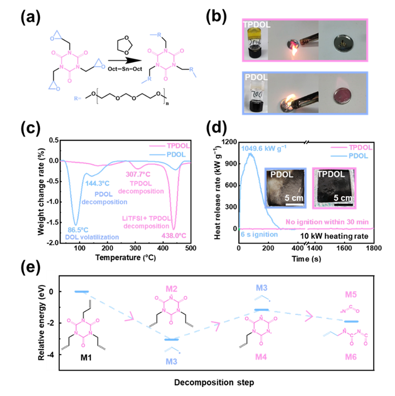 由于固态电解质具有固有的高热稳定性、不流动性和正/负极兼容性,因此电解质的固态化成为解决电池的安全性问题的终极方案。自支撑固态电解质具有较差的电极/电解质界面接触,不利于电池长期稳定循环,而原位聚合电解质因较好的界面接触和较低的界面电阻而受到越来越多的关注。然而,传统的聚烯烃基聚合物电解质通常需要添加额外的液态电解质,这不可避免地会影响电池的安全性。原位聚合1,3-二氧戊环(PDOL)是一种通过DOL开环聚合获得的聚醚基电解质,其不仅拥有较高的锂离子电导率(>1 mS cm−1),且与金属锂负极具有出色的兼容性而广受赞誉。尽管PDOL电解质不需要添加液态润湿剂,但DOL单体的残留和低聚物的存在会降低电池的安全性。一旦电池温度超过110 ℃,PDOL电解质就会发生热分解,生成气态易燃小分子产物(如DOL、甲醛等),影响电池安全性能。事实上,金属锂电池的热安全性主要与电解质的热稳定性及其在高温下与金属锂负极的相容性有关。因此,同时实现PDOL的高热稳定性与高电化学稳定性仍然是安全性金属锂电池的巨大挑战。