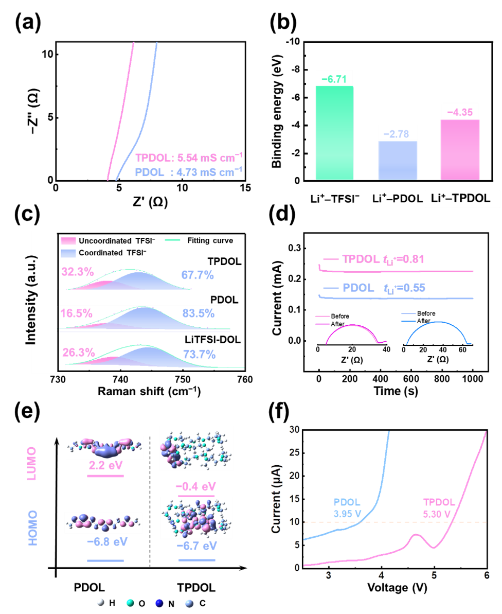 TPDOL电解质表现出更高的锂离子电导率,达到5.54 mS cm−1,与PDOL的醚基(−2.78 eV)相比,TGIC的羰基与锂离子的结合能更大(−4.35 eV),这有利于促进锂盐的解离,因此,在TPDOL电解质中出现了更多的解离态TFSI−。交联结构同样可以阻止TFSI−的移动。因此,TPDOL电解质的锂离子迁移数从0.55大幅增加到0.81。此外,引入TGIC后聚合物的交联有效地提高了聚合物水平,消除了自由DOL分子。TPDOL电解质的电化学窗口从3.95 V增加到5.30 V,具有很强的抗氧化能力(图2)