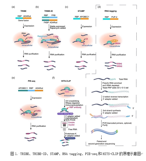 RNA结合蛋白(RNA-binding proteins,RBPs)是生物体内强有力的多功能调节因子,通过在多个水平上调节基因表达,在生物体发育、代谢和各种疾病中发挥重要作用。对RBP功能深入研究的需求,推动了RBP-RNA相互作用检测方法的快速发展。近年来,将RNA修饰酶(RNA modification enzymes,RME)与感兴趣的RBP融合的检测方法开发成为一个热门研究方向。该文章综述了包括作用于RNA的腺嘌呤脱氨基酶ADAR、末端核苷酸转移酶TENT和激活诱导的胞嘧啶脱氨酶/载脂蛋白B mRNA编辑酶催化多肽样(AID/APOBEC)蛋白家族脱氨酶在内的,RNA修饰酶的生物学功能、生物化学活性和来自于酶自身与其结构域和伴侣蛋白的底物特异性。同时,讨论了RNA修饰酶活性筛选系统,以及具有工程酶活性的RNA修饰酶突变。此外,文章提供了基于RNA修饰酶和基于交联和免疫纯化(CLIP)的RBP靶标检测策略的基本原理、优缺点和应用的系统概述,包括基于A-G的RNA编辑酶鉴定RNA结合蛋白靶标的TRIBE(Targets of RNA-binding proteins Identified By Editing)、基于RNA加尾酶的方法RNA Tagging、C-U的RNA编辑酶APOBEC1介导的编辑靶标分析技术STAMP(Surveying Targets by APOBEC-Mediated Profiling)、CLIP-seq及其衍生技术 (图1)。