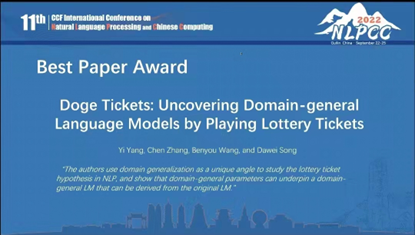 NLPCC(Natural Language Processing and Chinese Computing)是中国计算机学会主办的自然语言处理(NLP)和中文计算(CC)领域的高水平国际会议。NLPCC 2022于9月22日至25日在桂林举办,宋大为教授团队学生杨艺、张辰与香港中文大学(深圳)合作的论文“Doge Tickets: Uncovering Domain-general Language Models by Playing Lottery Tickets”被评选为最佳论文。