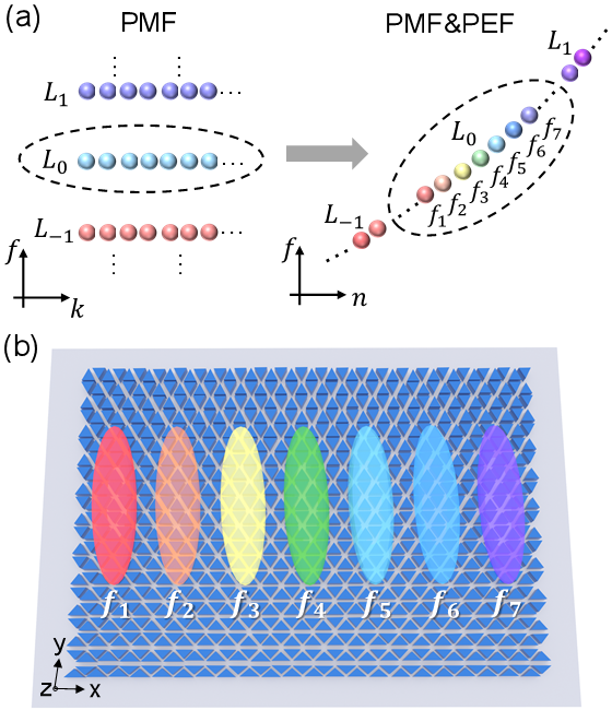图1. (a, b)赝磁场和赝电场协同作用下诱导的朗道彩虹现象示意图,不同频率的朗道零模被分开并局域到不同的空间位置。