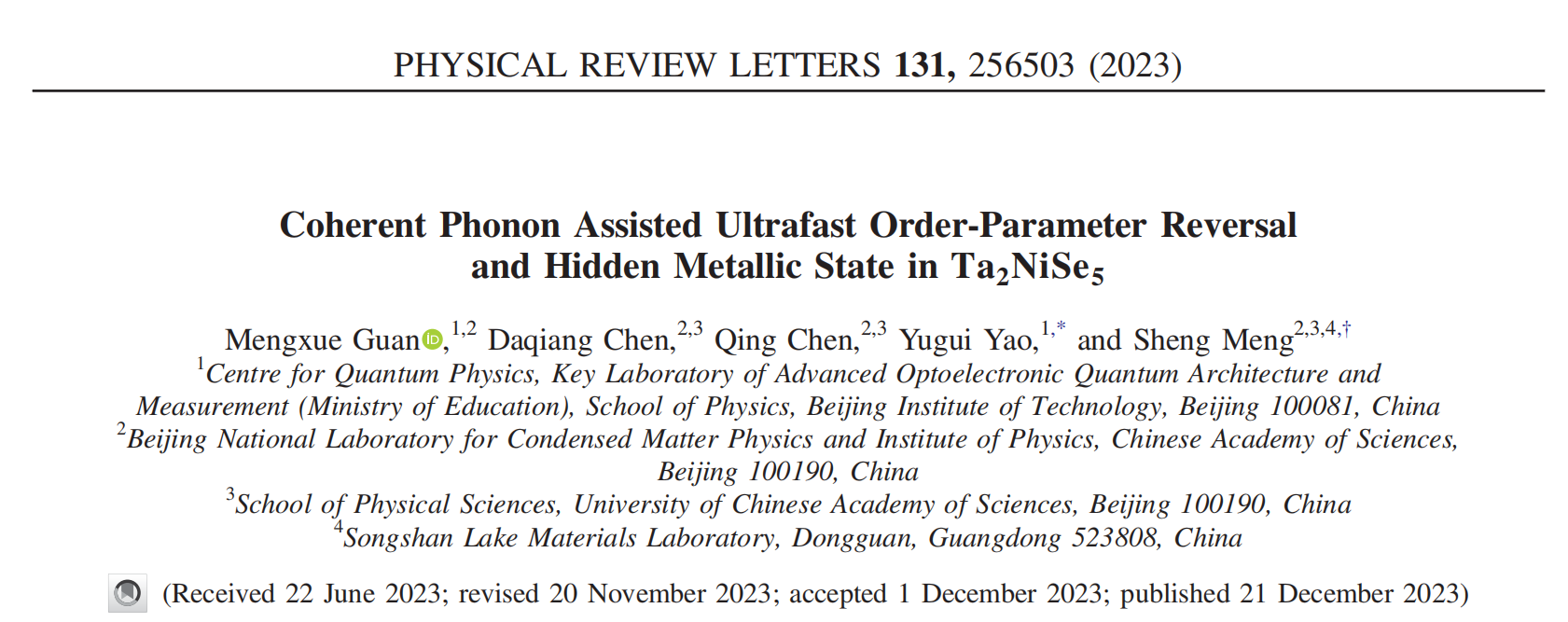 日前,北京理工大学物理学院姚裕贵、关梦雪特别研究员和中国科学院物理研究所的孟胜研究员团队展开合作,利用非绝热含时密度泛函分子动力学(TDDFT-MD)方法深入探究了Ta2NiSe5中的非平衡多体相互作用。研究明确了晶格序参量在光诱导绝缘体-金属转变过程中的关键作用,为理解关联量子材料中激子-声子动力学提供了全面的视角。相关研究题目为《Coherent Phonon Assisted Ultrafast Order-Parameter Reversal and Hidden Metallic State in Ta2NiSe5》,成果被发表在物理学领域的顶级期刊Physical Review Letters上。