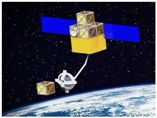 空间碎片问题日益严峻,如何安全地开展碎片消旋与捕获是研究难点与热点。采用空间绳网和机械臂捕获碎片是目前较为可行的捕获方法(图5)。针对空间绳网捕获法,团队成员单明贺助理教授等基于多柔体动力学绝对节点坐标法构建了“服务航天器-绳网-目标”的组合体系统动力学新模型,通过实验和计算相结合的研究思路,预测了系统的捕获动特性。对此类欠驱动系统,单明贺等还提出了基于系绳拉力的目标消旋控制算法,构建了末端执行器与目标的接触动力学模型,采用混合力位控制方法成功对目标碎片进行消旋。相关论文已发表于《Aerospace》(M. Shan, L. Shi. 9: 33, 2022),《Acta Astronautica》(L. Shi, X. Xiao, M. Shan* et al. 193: 469-482, 2022)。研究成果已经被我国航天部门应用于绳网捕获系统的设计。在多柔体动力学建模研究方面,团队成员韩石磊副教授基于对偶四元数、变域哈密顿变分原理提出了系列可用于多柔体动力学分析的新有限单元,可实现系统高效建模和计算,研究成果发表于计算力学顶级期刊《Computer Methods in Applied Mechanics and Engineering》(S. Han. 395: 115063, 2022),获同行专家高度评价。此外,团队博士生王帅等提出了基于立方形星群组装的空间碎片清除与防护技术方案,获得了世界大学生立方星挑战赛中国区总决赛特等奖(图6)。
