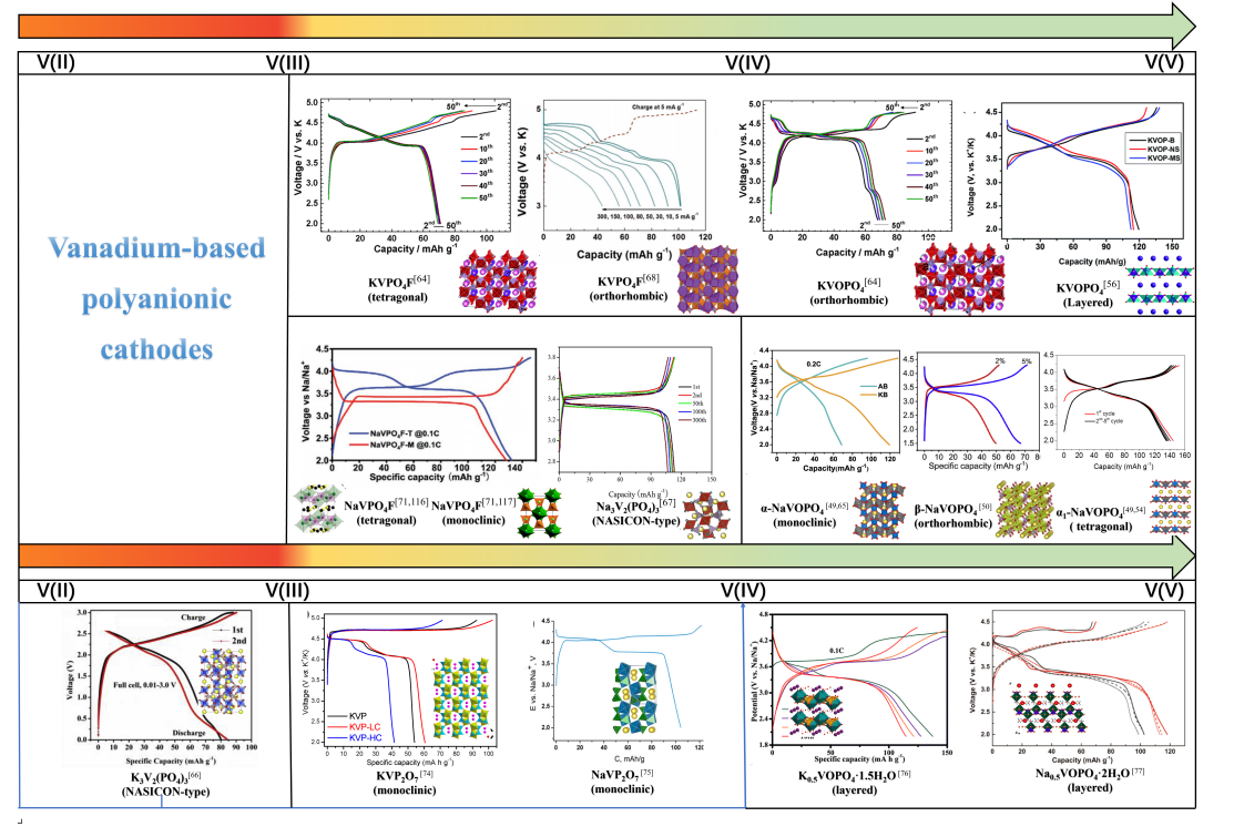 聚阴离子化合物是由MOx(M为过渡金属)和 (XO4)n(X="P,S,as,Si,Mo或W)多面体组成的三维开放框架结构。其独特的结构具有许多的优势,如:良好的离子扩散动力学、由聚阴离子基团的诱导效应实现的高工作电压、快速的钠、钾离子扩散实现的高能量密度以及聚阴离子框架提供的热稳定性、安全性,使其在锂、钠、钾离子电池领域中作为正极材料具有非常普遍的应用。研究中对比了相似的聚阴离子正极材料在钠、钾离子电池中的不同结构、性能表现上的差异,对于发展高性能聚阴离子正极电池,拓宽和深化其应用领域具有指导意义。基于近年来的诸多研究进展,本综述围绕钒基、铁基、钛基三种类型的聚阴离子正极材料,较为系统地分析比较了它们在钠钾电池中离子嵌入/脱嵌机理、比容量、循环性能、倍率性能等方面的差异,总结和评述了不同材料在钠/钾离子电池中的优势,并对相关挑战和未来发展趋势进行了一系列地讨论。