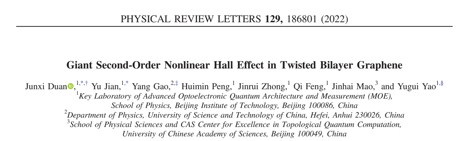 Junxi Duan*,†, Yu Jian†, Yang Gao*, Huimin Peng, Jinrui Zhong, Qi Feng, Jinhai Mao, and Yugui Yao*,“Giant Second-Order Nonlinear Hall Effect in Twisted Bilayer Graphene”,Phys. Rev. Lett. 129, 186801 (2022) (†为共同一作,*为通讯作者)