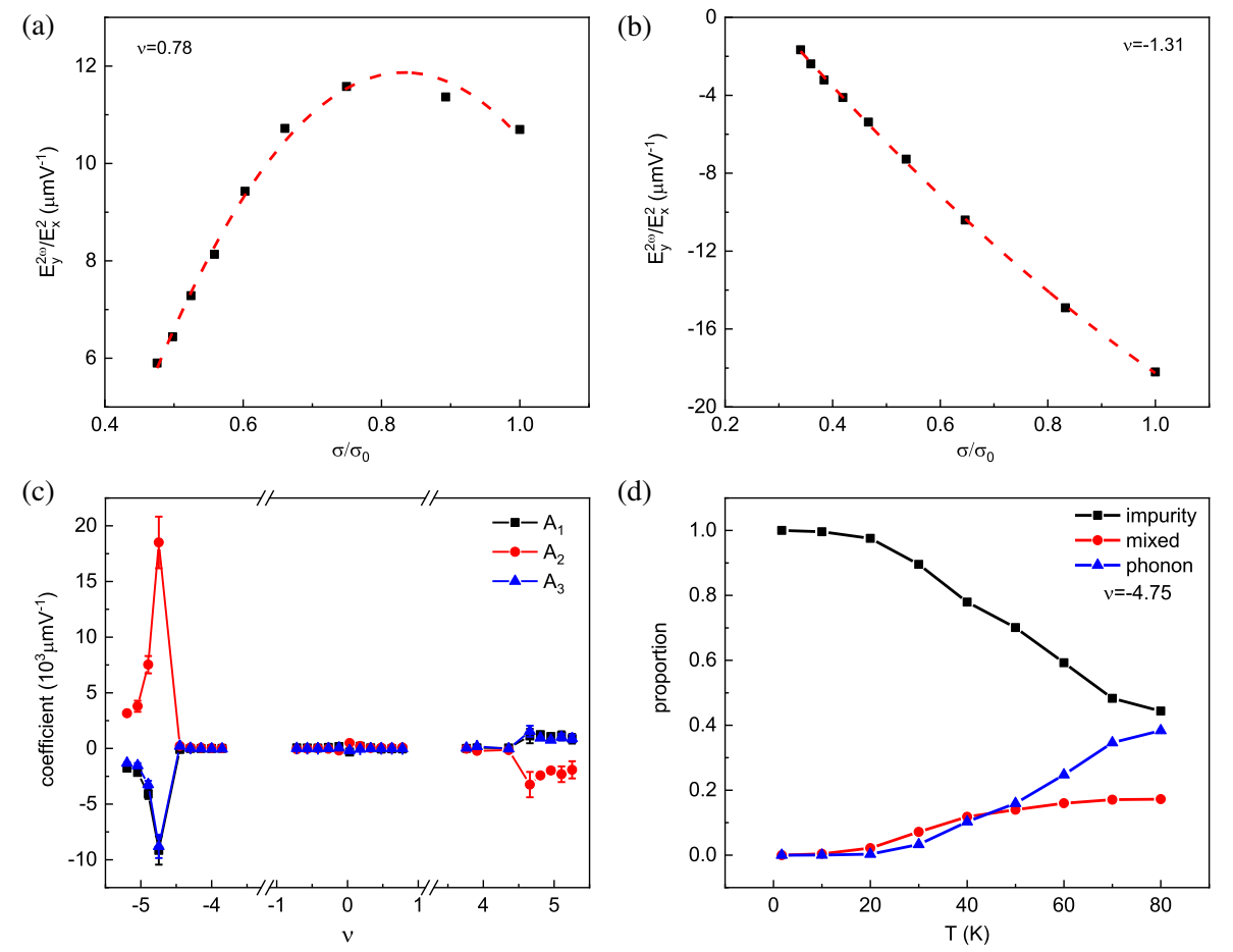该研究工作有以下两个亮点:(1). 研究团队首次在转角石墨烯体系中观测到了巨非线性霍尔效应。获得的非线性霍尔电导比之前报道的WTe2以及转角WSe2等体系中的观测值至少大两个量级,如图1所示。(2). 通过标度分析,研究团队首次严格区分了散射机制中不同散射源的贡献。不同于之前研究中只讨论了杂质引起的skew scattering,该工作首次观测到了声子引起的skew scattering贡献,并揭示了声子的贡献随着温度上升可以与杂质贡献相当,如图2所示。