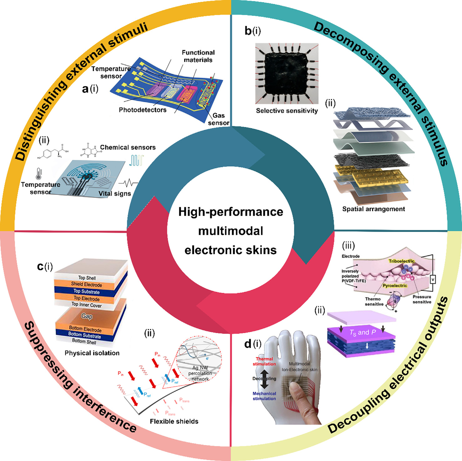 本文综述了多模态电子皮肤在识别和分解外界刺激、抑制干扰和去耦输出等方面的关键技术(图1所示),主要包括以下四个方面: