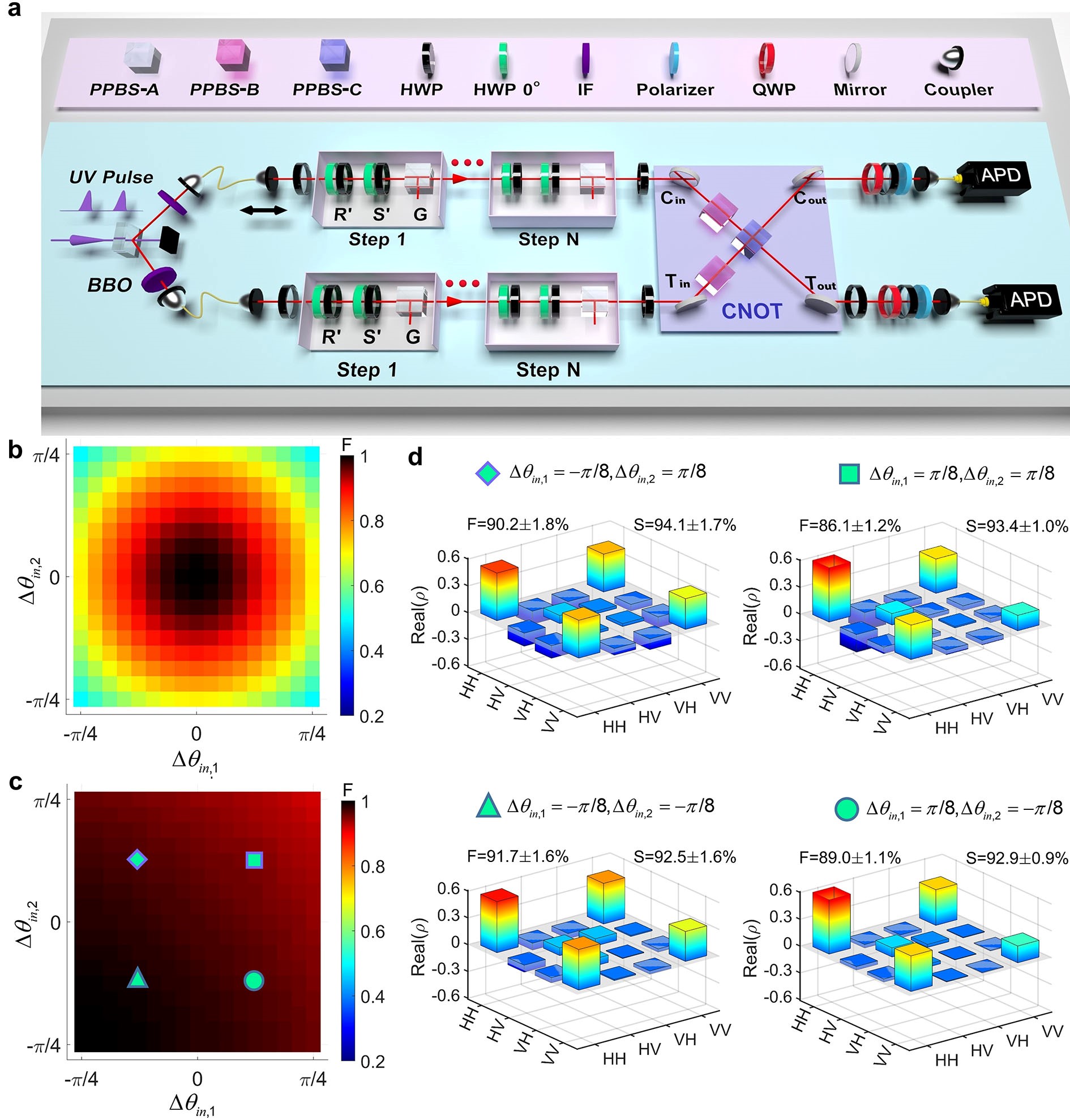 研究人员实验验证这一纠缠态产生方案的鲁棒性。实验上在入射前分别对上下两路光子加入扰动(− / 4,  / 4)来模拟外界环境对入射态的影响。 如图4b所示,当光子直接传输至两比特门而未经过量子行走时,只有在几乎没有扰动的情况下,保真度才能保持较高的值。然而随着扰动的增加,保真度急剧下降,在图示的条件下保真度已经低于0.5。相反,如图4c所示,当上下两路光子都经过带有奇异线的非厄米量子行走时,几乎所有扰动下的保真度都很高。