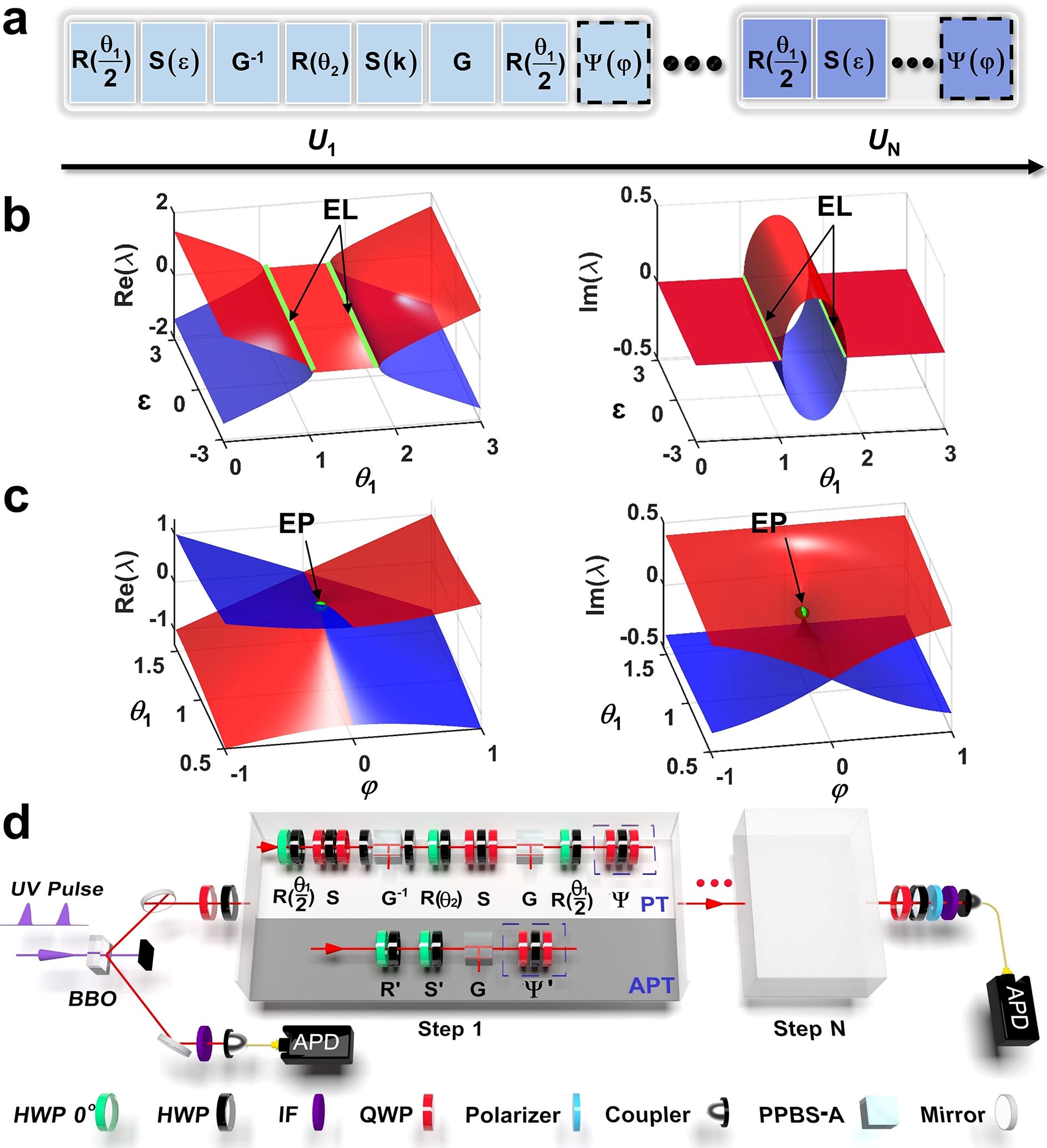 之前的研究都是使用哈密顿量来描述环绕奇异点的动力学特性。在该工作中,研究团队构造了非厄米量子行走来描述环绕奇异点或奇异线的动力学过程。如图1a所示是一个包含N步的非厄米量子行走系统来控制量子态的演化的示意图,其中第1步(N)的演化过程由时间演化算子 U 1 ( U N )描述。这里的非厄米量子行走是由多种算符组成的。以第一步为例,可以表示为1.png。其中旋转算符形式为2.png,相位平移算符为3.png,增益损耗算符为4.png。通过恰当选择参数,可以得到奇异线,如图1b所示绿色线。当在量子行走中引入算符5.png=6.png(图1a中的虚框),就可以得到孤立的奇异点,如图1c所示。