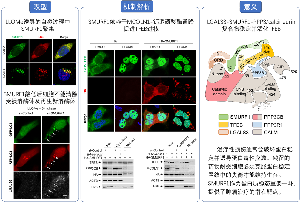 细胞通过一系列的机制将胞质中的废弃物质包被进囊泡中,与溶酶体融合实现降解、回收、再利用维持细胞质量控制稳态。自噬降解是其过程中众所周知非常重要的一环,参与如生理和病理炎症,衰老,感染,免疫及癌症发展等过程。自噬-溶酶体稳态再平衡受到核心转录因子EB(TFEB)的正向反馈机制受。mTOR磷酸化TFEB S211从而抑制其进核,同时,钙调磷酸酶(PPP3/calcineurin)可以去磷酸化TFEB激活其进核启动一系列与溶酶体生成、自噬相关基因转录。然而在溶酶体损伤情况下,致癌蛋白SMURF1在TFEB激活调控的过程中是否参与及其机制尚不明确。董磊教授团队长期致力于自噬蛋白质稳态和癌症治疗,基于此前课题组的工作结果以及现有的报道表明,SMURF1在癌症发展(2020,Oncogene)、聚集体与病原体的清除以及恢复内膜损伤后的细胞稳态等方面扮演重要角色。对此董磊课题组深入研究了SMURF1在溶酶体内膜损伤条件下的响应,发现SMURF1可促进TFEB进核。进一步的实验和分析确立了一种LGALS3-SMURF1-PPP3/calcineurin复合体模型,该复合体稳定与活化TFEB,从而促进其核易位激活(图2)。其意义在于,治疗性损伤通常会破坏蛋白稳定并诱导蛋白毒性应激。残留的药物耐受细胞必须克服蛋白稳定网络中的失衡才能维持生存。认知了肿瘤治疗的潜在靶点SMURF1作为蛋白质稳态再平衡中的重要影响。