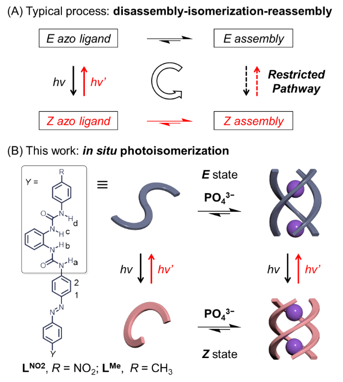吴彪教授研究团队一直致力于阴离子配位作用相关的基础理论和前沿应用交叉研究,发展了“阴离子配位诱导组装”的新策略,实现了一系列超分子组装结构的精准调控 ( Acc. Chem. Res. 2022, 55, 3218-3229)。研究发现,得益于阴离子配位作用的预组织多重氢键网络结构,形成的组装体具有强的结构灵活性和自适应性,能够发生类似于“弹簧”变化的分子运动 ( Angew. Chem. Int. Ed. 2021, 60, 9389-9394)。近期,利用偶氮苯骨架的多脲配体与磷酸根离子的配位作用,偶氮苯的顺-反异构化行为能够控制组装结构(四面体笼和三股螺旋体)的可逆变化。在此基础上,为了厘清组装结构对偶氮苯光异构化行为的影响,他们系统研究了三股螺旋体的光异构过程。实验结果表明:偶氮苯光异构化过程中,三股螺旋体发生了“原位”光异构化现象(如图1B所示);这与普遍认知的“解离-光异构化-重组”过程明显不同。