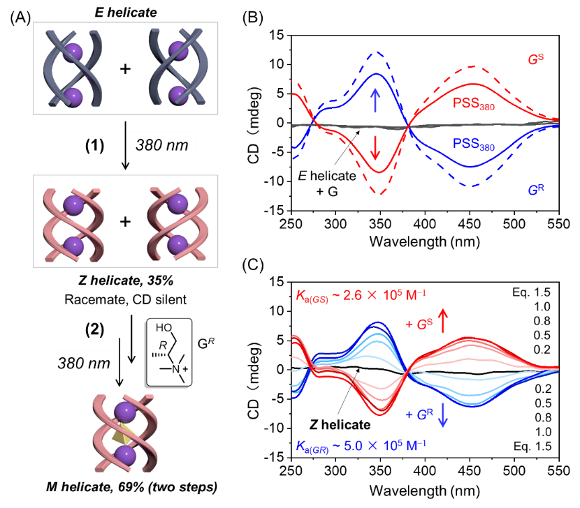 利用外部刺激调节超分子手性(如开/关、强度变化和手性反转)不仅有助于理解生命体中的手性行为,而且能够为设计传感、催化和数据处理的新型手性光学材料提供参考方法。鉴于顺式三股螺旋体优异的客体结合能力,以α-甲基胆碱衍生物作为手性客体,通过光照和手性客体引发诱导了同手性三股螺旋体的形成。圆二色光谱(CD)证实了光激发-手性结合的串联作用对手性三股螺旋体的调控,如图3所示。