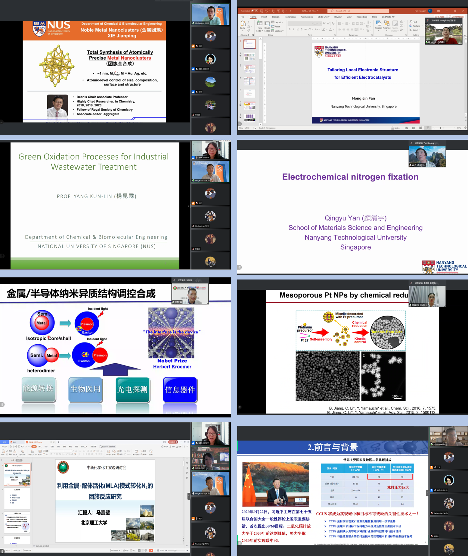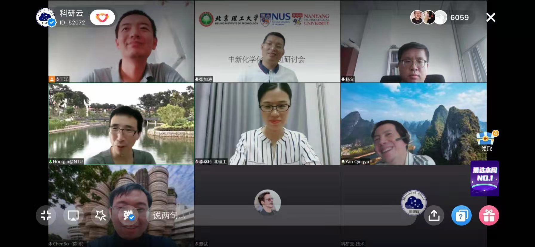 为了深化双方在各个领域的合作,化学与化工学院在国际交流与合作处的大力支持下,在云端组织了中新化学化工双边研讨会,邀请了新加坡国立大学、南洋理工大学以及我校化学、化工领域的专家、老师通过线上会议的形式,交流学术成果,探讨合作交流。首先,化学与化工学院院长张加涛回顾了北理工与新加坡高校合作交流的历史,希望双方进一步加强在师资培养与科研方面的交流。新加坡国立大学的Jianping Xie,Kun-Lin Yang教授,以及南洋理工大学的Hong jin Fan,Qingyu Yan教授分别介绍了他们在纳米团簇合成、工业废水的绿色处理过程、电催化产氢以及固氮方面的科研进展,北京理工大学的张加涛、李翠玲、马嘉璧、刘贺磊四位教授介绍了他们在纳米结构合成、多孔金属电催化、原位团簇化学、碳捕获技术方面的科研工作。报告人同与会师生进行了热烈互动。