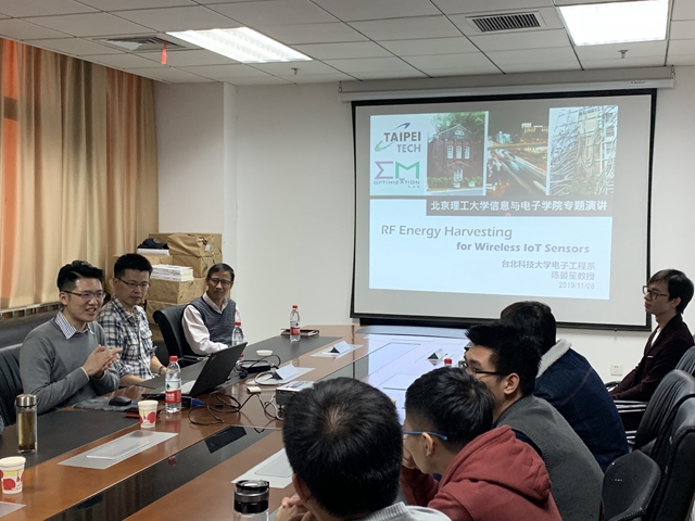 11月8日下午,北京理工大学信息与电子学院联合研究生院邀请台北科技大学电子工程系陈晏笙(Yen-Sheng Chen)教授、曾柏轩(Po-Hsuan Tseng)教授来校进行学术交流。陈晏笙教授应邀做了题为“RF Energy Harvesting for Wireless IoT Sensors”的“21世纪学科前沿”系列学术报告。出席此次会议的有信息与电子学院王华教授等十余名教师、博士研究生和硕士研究生。