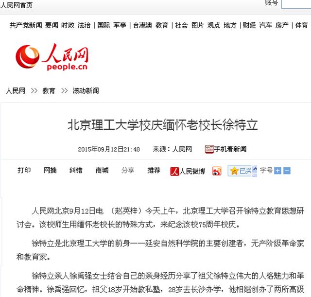 人民网北京9月12日电(赵英梓)今天上午,北京理工大学召开徐特立教育思想研讨会。该校师生用缅怀老校长的特殊方式,来纪念该校75周年校庆。