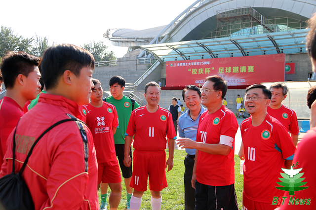 9月19日下午,在北京理工大学喜迎校庆75周年的日子里,首届“校庆杯”足球邀请赛在东操场举行。参赛的一方由北京理工大学老校友元老队加上北理工学生足球队的部分队员组成,另一方是由北京理工大学首届“军工杯”足球邀请赛的九支参赛队中精英组成的军工骄子联队。北京理工大学校长胡海岩院士,原北京市副市长、老校友范伯元教授,北理工足球队总顾问金志扬教授,北京理工大学副书记副校长项昌乐教授等参加了比赛揭幕仪式并与双方队员合影留念。